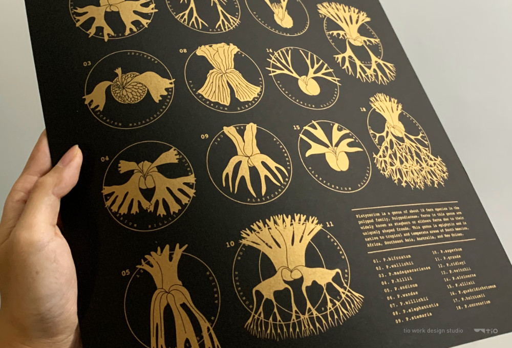 將原生18種鹿角蕨一一繪製展現各有的特色,尺寸為A3,此版本以黑色厚紙,加上金色油墨印製。